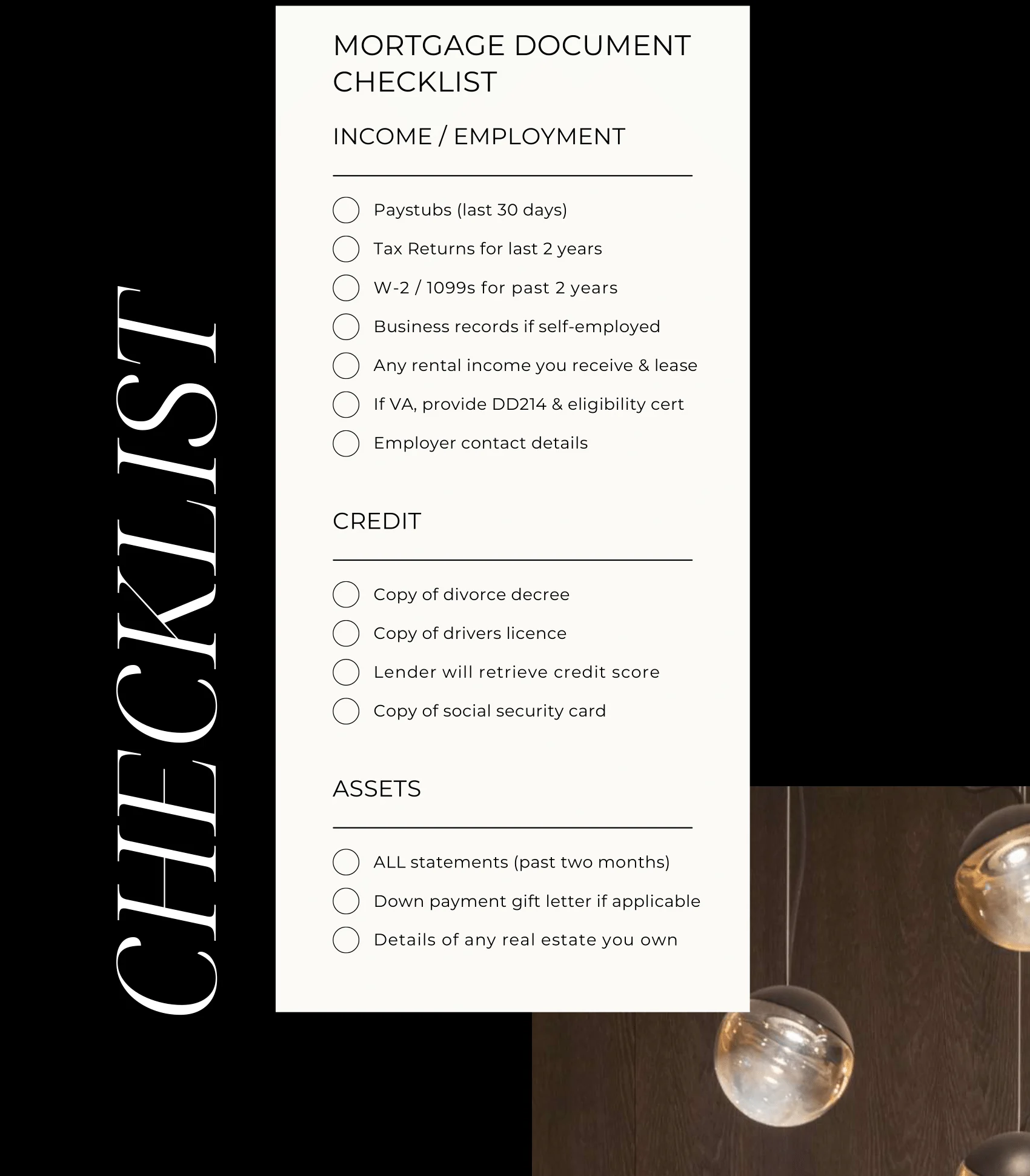 - Don’t buy ANYTHING! (furniture, appliances, etc.)